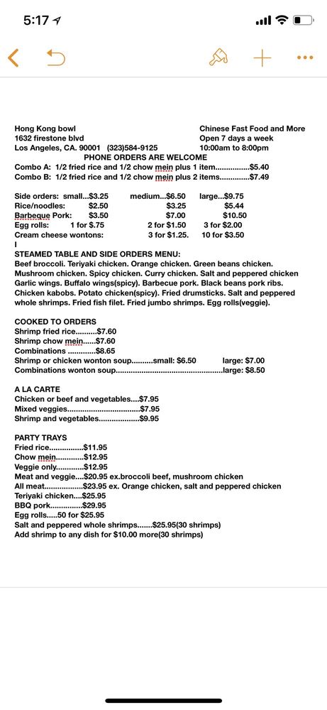 Welcome to Hong Kong Bowl, a delightful Chinese eatery located at 1632 Firestone Blvd, Los Angeles. This cozy establishment is perfect for a quick meal, offering a range of utilities including takeout, delivery, and catering, making it an excellent choice for families and groups. The atmosphere is casual yet classy, ideal for enjoying flavorful dishes like their famous wonton soup and orange chicken.